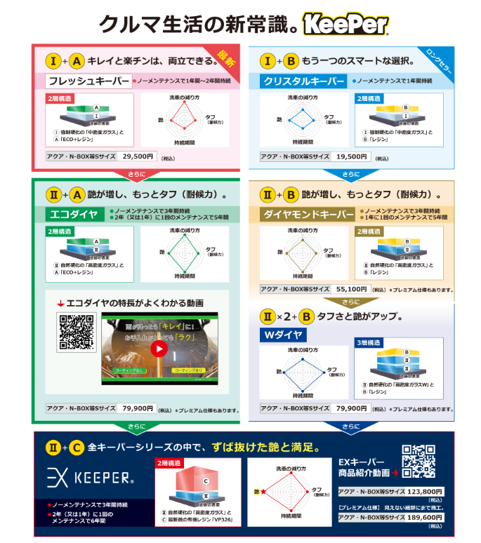 キーパー プロショップの「キーパーコーティング」はその艶と耐久性が自慢のコーティング。ポリマー系の「ピュアキーパー」、ガラス系の「クリスタルキーパー」「ダイヤモンドキーパー」「Wダイヤモンドキーパー」「エコダイヤキーパー」5つのコーティングを揃え、お客様のニーズやカーライフに合わせてご提案しています。