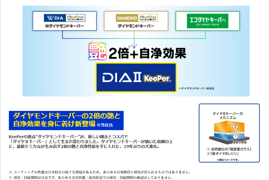 当店イチオシ!3年~5年耐久のダイヤモンドキーパー。高密度のガラス被膜により、クリスタルキーパー、フレッシュキーパーよりも、深いツヤと輝きをお約束します。