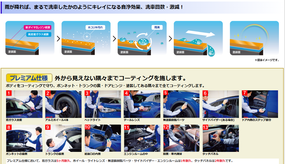 高密度のガラス被膜にECOダイヤ専用のレジン被膜(2層目の被膜)が愛車の汚れをガッチリガードします。