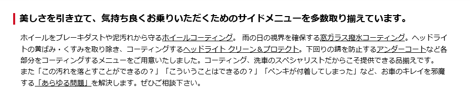 愛車を「ちょっとキレイにリフレッシュ」したい方から「こだわり派」の方まで、専門店ならではの品質とサービスで、きっとご満足いただけるものと確信しております。
