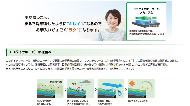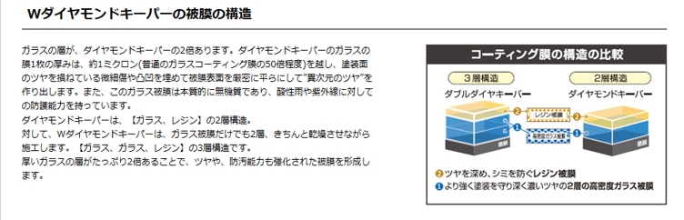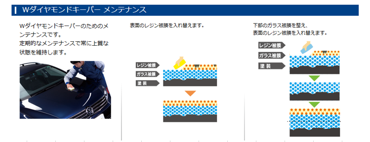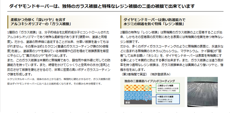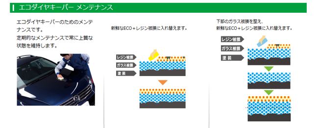高密度のガラス被膜にECOダイヤ専用のレジン被膜(2層目の被膜)が愛車の汚れをガッチリガードします。