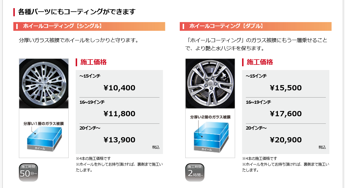 ボディコーティングと一緒にホイールもピカピカにしませんか?ホイールコーティングしてあると、汚れが付きにくくなり付いても簡単にキレイに汚れを落とせます。