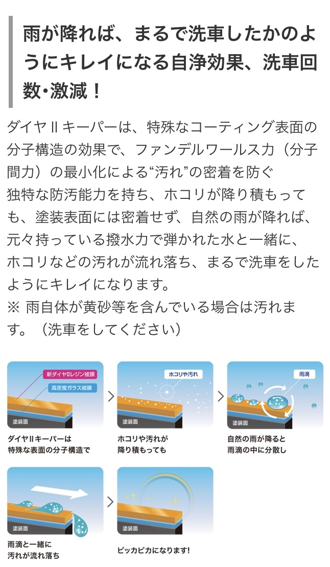 ホコリなどの汚れも水とともにはじくため、通常の雨程度であれば、まるで洗車をしたかのように車がキレイになり、