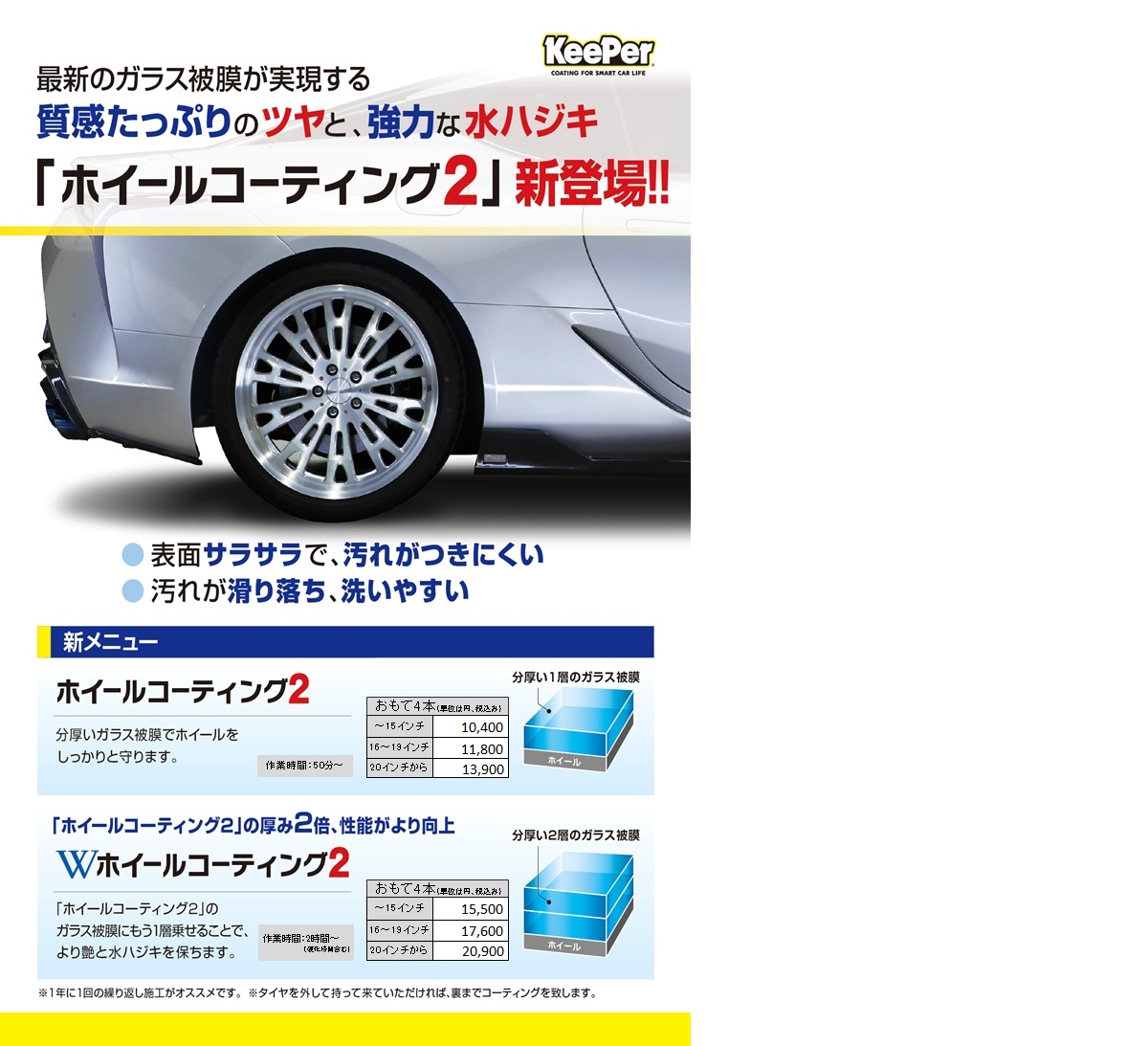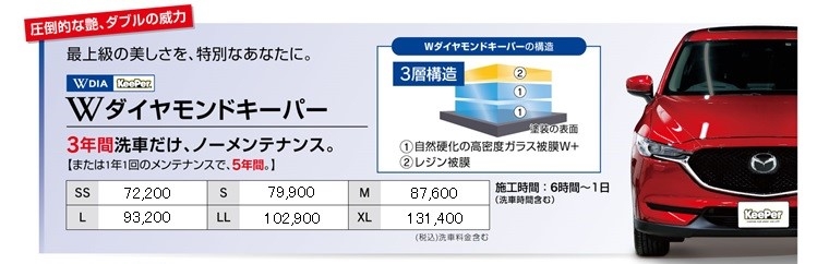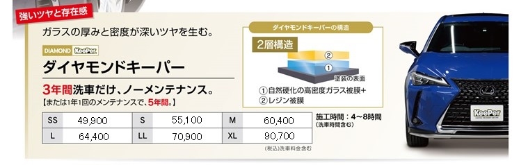 ダブルダイヤモンドキーパーは、ガラスの層がダイヤモンドキーパーの2倍あります。厚いガラスの層が2倍あることで、ダイヤモンドキーパーよりさらに、ツヤや防汚能力も強化させた被膜を形成します。