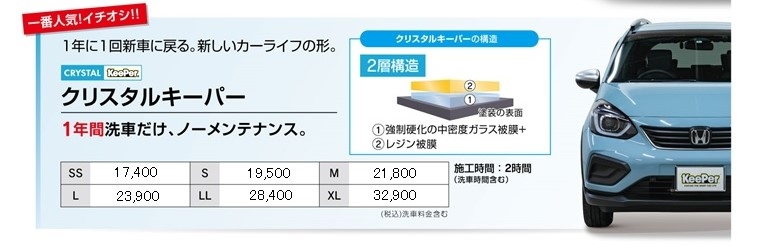 お車の状態や大きさによりますが標準的な車(Mサイズ)の場合、作業時間は2時間程度です。 クリスタルキーパーは1年に1度施工することによって、ツヤと水はじきなどの効果を続けて維持するだけでなく、回を重ねるほど塗装そのものの平滑が促進させます。
