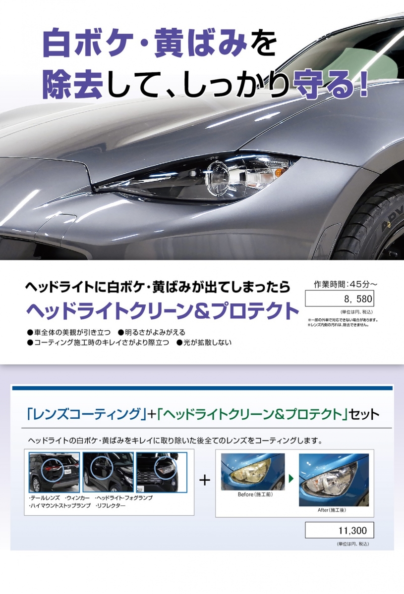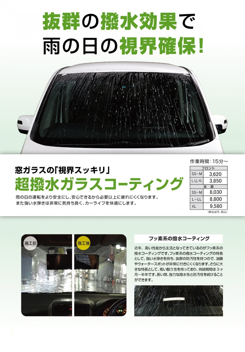 朝お預けいただければ、当日の夕方から夜にはお渡しできます。事前にご予約いただければ代車の無料貸し出しも承ります。施工には、1年に1回のメンテナンスを行って5年間持続目安のプランとメンテナンスをせず、洗車だけで、3年間持続目安のプランのどちらでもお選びいただけます。施工者にご相談ください。