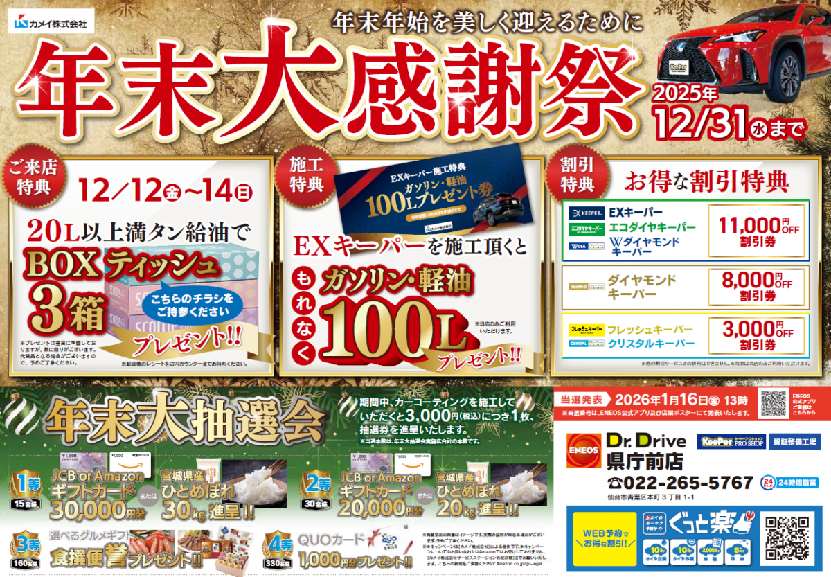 当店では、12月に行われる年末大抽選会の施工予約を、随時承っております。ご好評につき、施工予約が取れない日もございますので、お早めにご予約を頂きますようお願い申し上げます。詳細につきましては、お電話に...