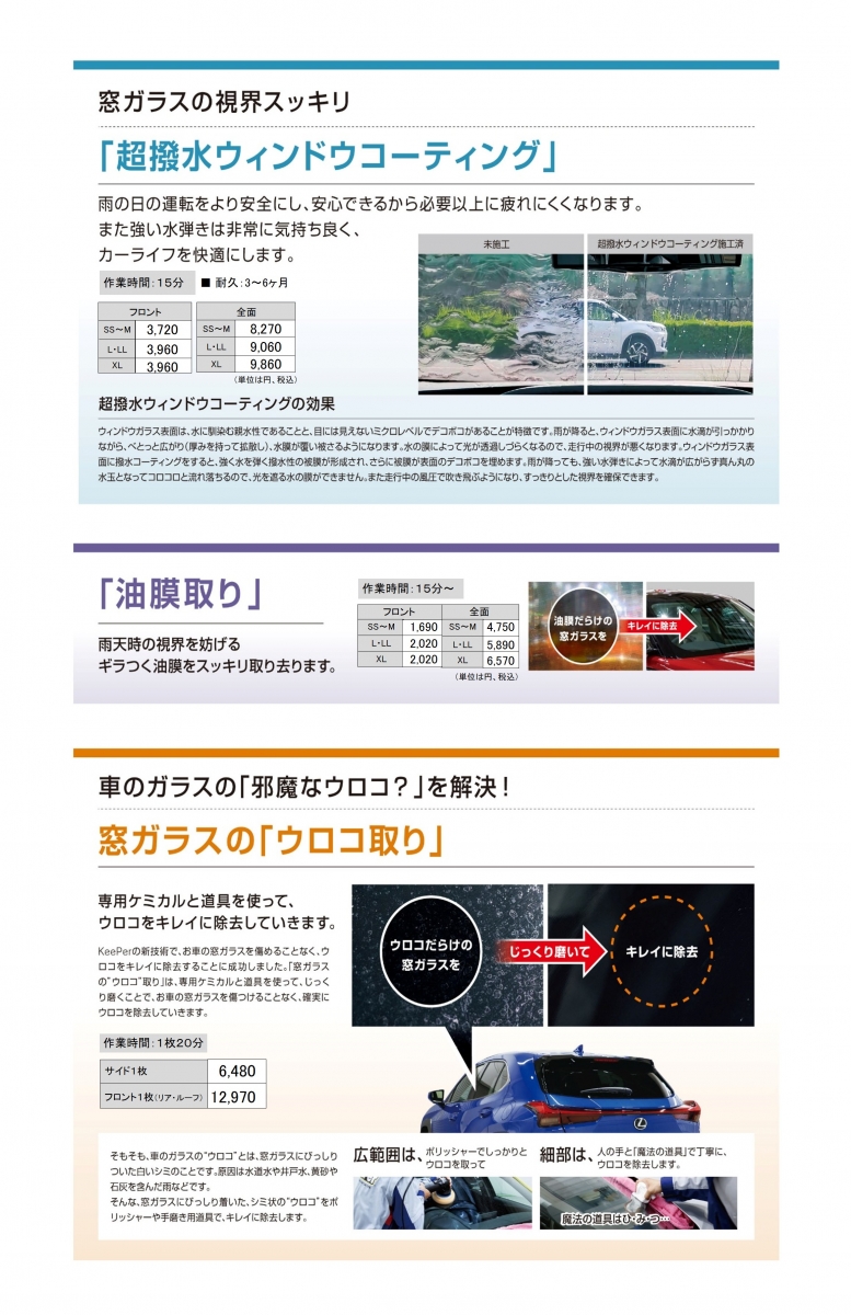 ■特長 圧倒的な撥水力で水だけでなくホコリなどの汚れの原因を水もろとも弾くので逆に車がキレイになってしまう不思議なコーティングです。その為洗車回数が減り普段のお手入れが楽になります。※定期的な洗車は必要です。