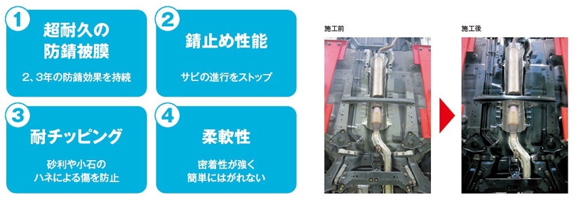 - 柔軟性のある被膜のため、密着性が高く剥がれ難く、飛び石が被膜に当たっても従来の防錆剤より傷が小さくなり、修復できない大きな傷でも傷以外の部分にサビが広がりません。