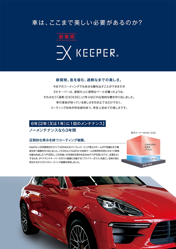 Q新車を購入したのですが、すぐコーティングしても大丈夫ですか? A・コーティングは、納車後すぐのタイミングがお勧めです。キーパーコーティングは、非常に細かい分子でコーティングを定着させていきます。 例えば、塗りたての塗装でも、通気性に優れておりますので塗装の乾燥過程に出てくるガスも、コーティングした後でもキレイに抜けていきます。 多くのガラスコーティングに入っているキシレンなどの『有機溶剤』を使わないため塗装に優しく、侵食してしまうことはありませんのでご安心してお任せ下さい。
