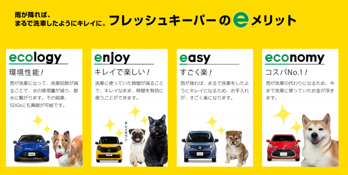 自然の雨が洗車になる。また、大きな節水効果と洗剤の使用も減らしてSDGsにも貢献。