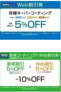 【Web割引5%OFF】 こちらをプリントアウトするか、携帯画面でお見せいただくと、ボディーコーティングを5%OFFにて施工させて頂きます。 対象商品は『クリスタルキーパー』・『ダイヤモンドキーパー』です。ご注文の際、スタッフが確認をさせて頂きます。 新車登録より6ヶ月以内のお車の場合、ボディーコーティングを5%OFFにて施工させて頂きます。 対象商品は『クリスタルキーパー』・『ダイヤモンドキーパー』です。ご注文の際、スタッフが確認をさせて頂きます。