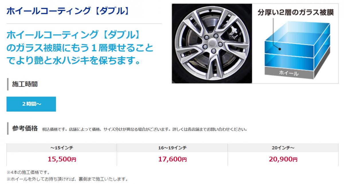 ■持続期間・施工時間 ノーメンテナンス、洗車だけで3年耐久(初回施工は6?18時間) 1年1回のメンテナンスで5年耐久(作業時間は1?2時間程) ※施工価格をクリックすると、お車のサイズが確認出来ます。