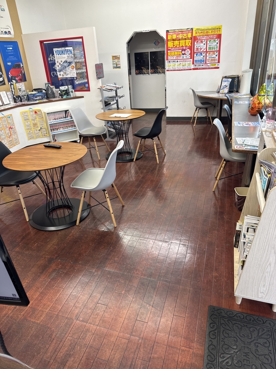 お車のメンテナンスの等の際にご利用いただけるゲストルームになります。キレイになるお車を観ながらお待ちいただけます。