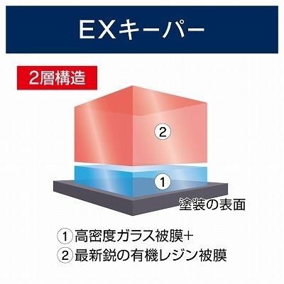 新車用に新開発されたEX キーパーは、桁違いの圧倒的な厚みを生む「VP326」の下に、ダイヤモンドキーパーのガラス皮膜に匹敵する「プライマーガラス」を施工することで、新車を超えた過剰とも言えるほどの艶と美しさを実現します!