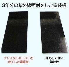 (財)塗装検査協会のウエザーサンシャインメーターという塗装の耐久試験により、自然界の数十倍の紫外線を均一に塗装板に連続照射し、何年分の紫外線で塗装劣化するか調べたところ、標準的な黒色のソリッド塗装はカーコーティングなしで3年から3年半の紫外線照射で塗装劣化が始まることがわかりました。
