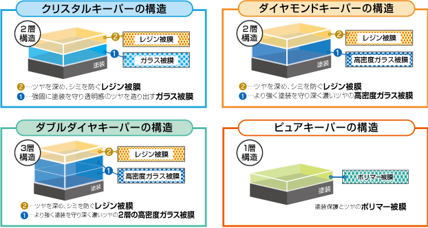通常のボディガラス系コーティングの約50倍もの厚みのあるガラス被膜の上にさらにもう1層「ガラス被膜」を形成し、その上に水シミの固着を防ぐ「レジン被膜」を塗布。3層の強靭なボディガラスコーティングはダイヤモンドキーパーを更に凌駕し、目に見えて、新車を超えた艶と美しさを実感出来ます。