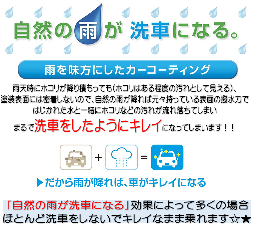 〇一年間お車の綺麗を守るだけでなく、紫外線・酸性雨などによるお車の塗装劣化から守ります。
