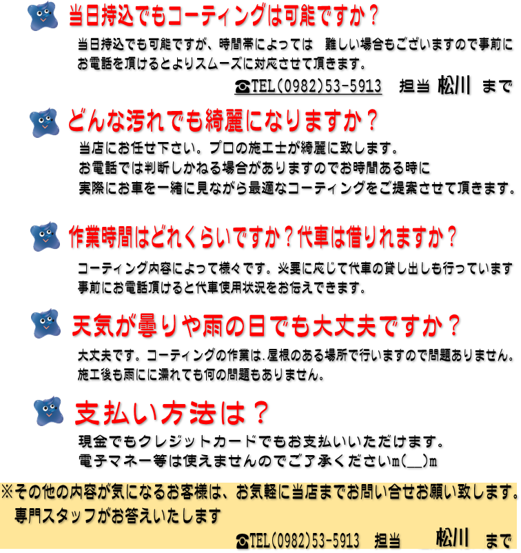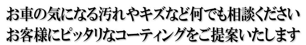 カーコーティングや車の「キレイ」に関する事、車の状態を見て欲しいなど、ご来店でのご相談、お問い合わせ喜んで承ります。