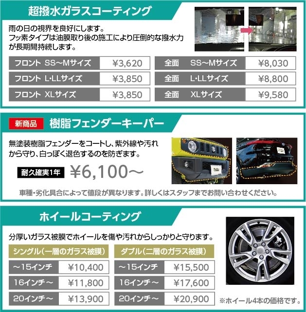 当店は、キーパープロショップ認定店でボディコーティング、ガラスコーティング、または足元もキレイにとホイールコーティングまで「車をキレイに!」をモットーにお客様に喜ばれる洗車を目指し!日々運営しております。
