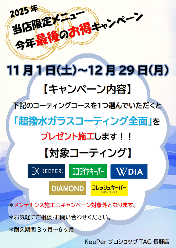 こんにちは。KeePerプロショップTAG長野店です。朝晩の空気がぐっと冷たくなってきました。長野の山々も少しずつ色づき、赤や黄色のグラデーションが広がっています。この季節、思わずドライブに出かけたく...