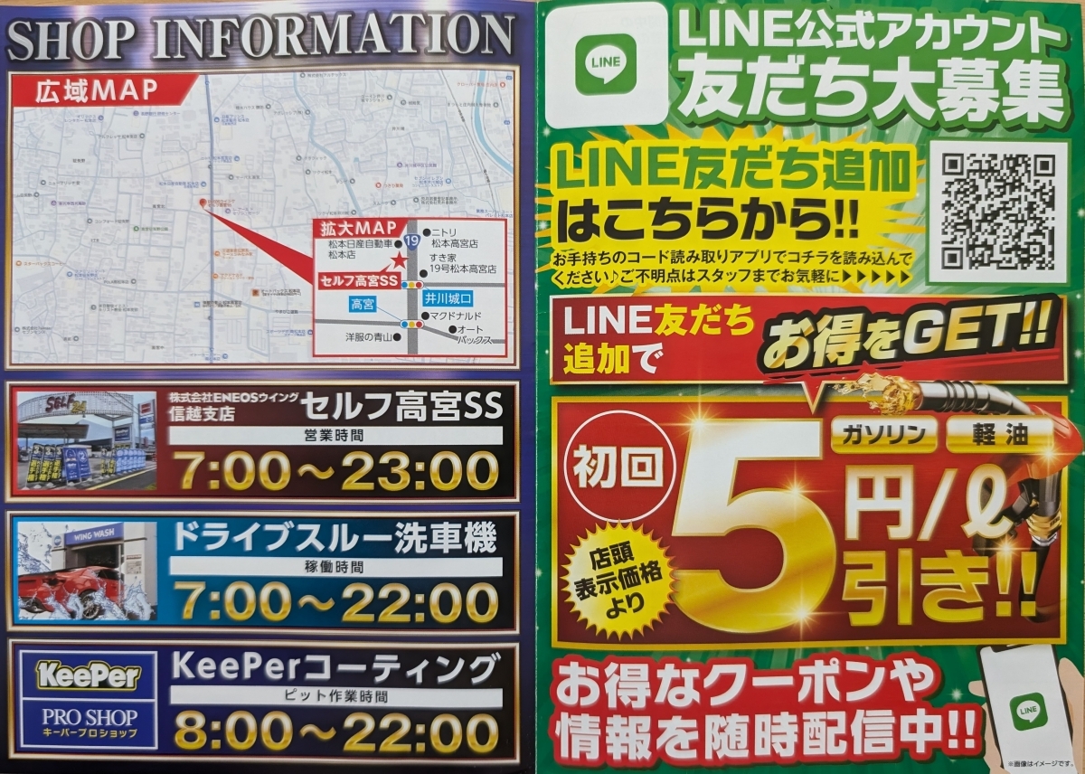 フォローしていただくと、燃料5円引き(1回限り)or手洗い洗車1回無料クーポン券