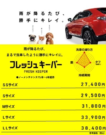 新商品!「フレッシュキーパー」フレッシュキーパーは汚れの密着を防ぐ独特な防汚能力を持ち、ほこりが降り積もっても塗装表面には密着せず、自然の雨が降れば元々持っている撥水力で、雨と一緒に汚れが落ち、まるで洗車をしたようにキレイになります。