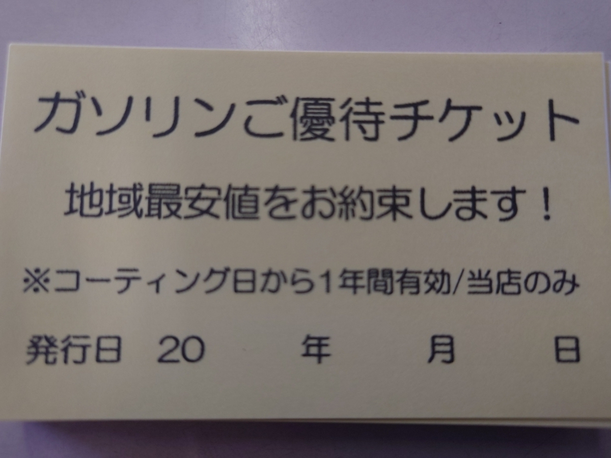 当店にてキーパーコーティングを施工されたお客様へささやかですが、燃料がお得になるチケットを差し上げております✨