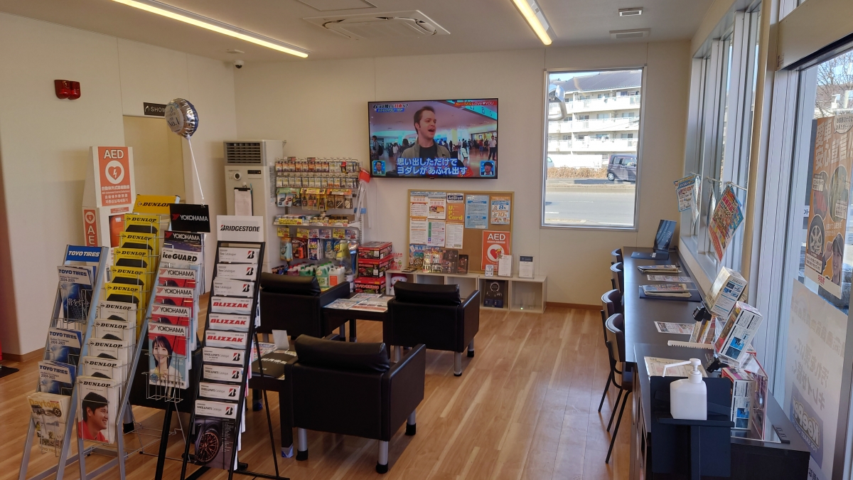 ドライブスルー洗車後の拭き上げコーナーも併設しています。拭き上げ用タオル、タイヤWAX、掃除機を設置しています。
