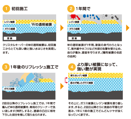 厚いガラスの層がたっぷり2倍あることで、ツヤや、防汚能力も強化された被膜を形成します。