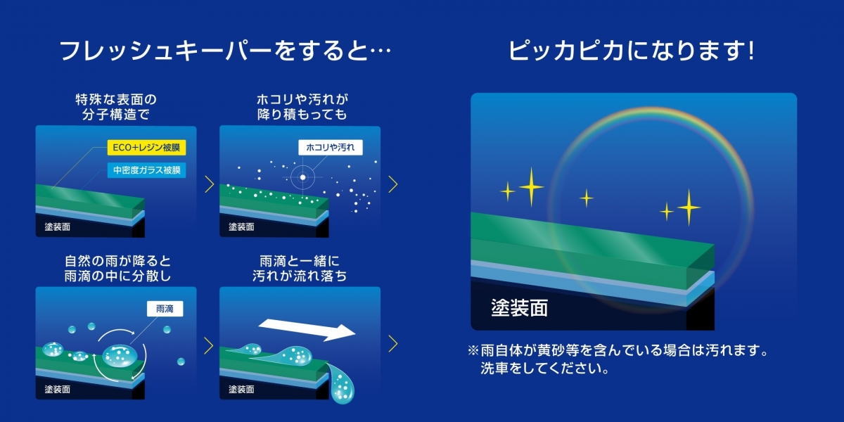 フレッシュキーパーは、汚れの密着を防ぐ独特な防汚能力を持ち、ホコリが降り積もっても塗装表面には密着せず、自然の雨が降れば元々持っている撥水力で、雨と一緒に汚れが流れ落ち、まるで洗車をしたかのようにキレイになります。
