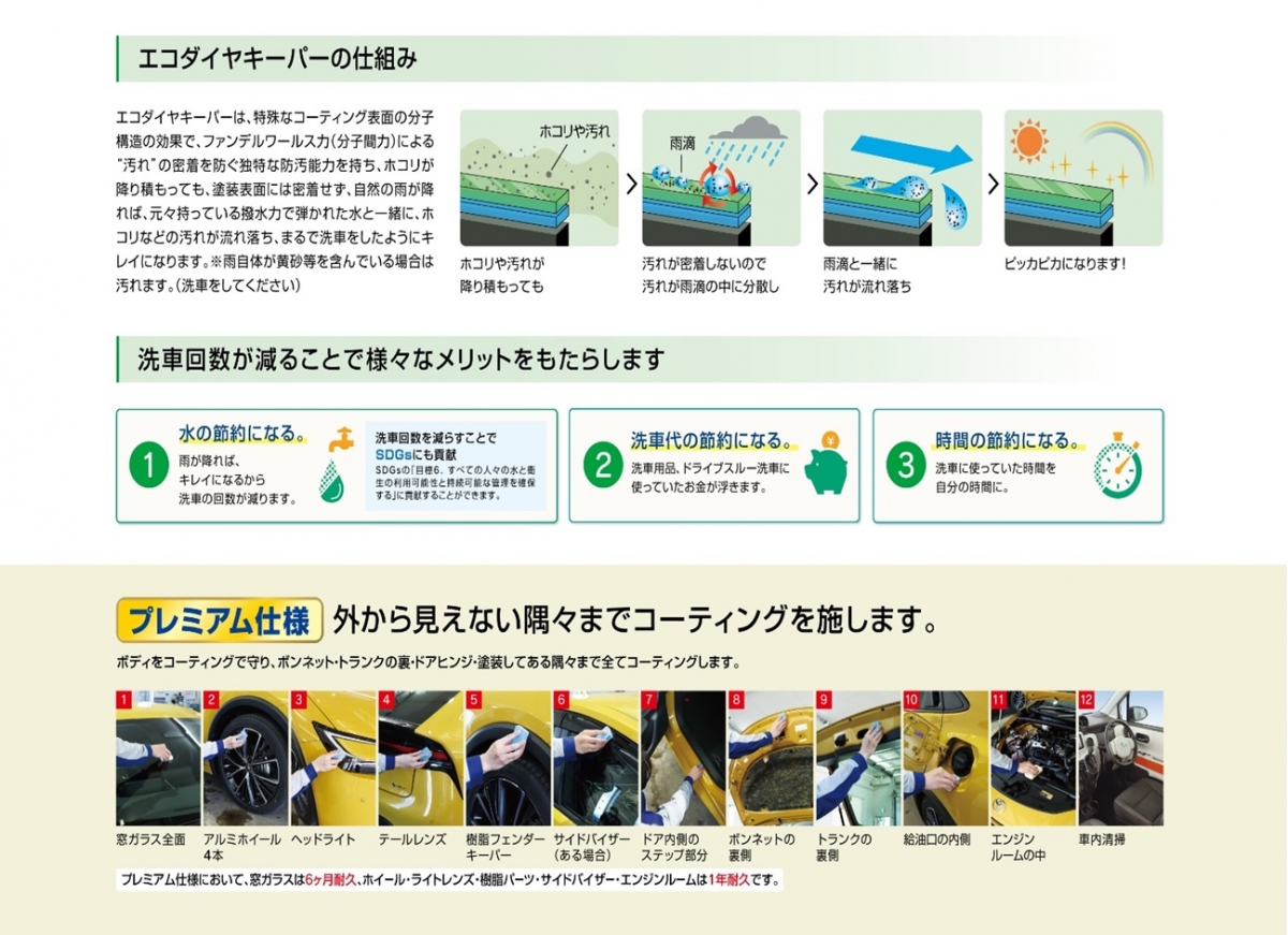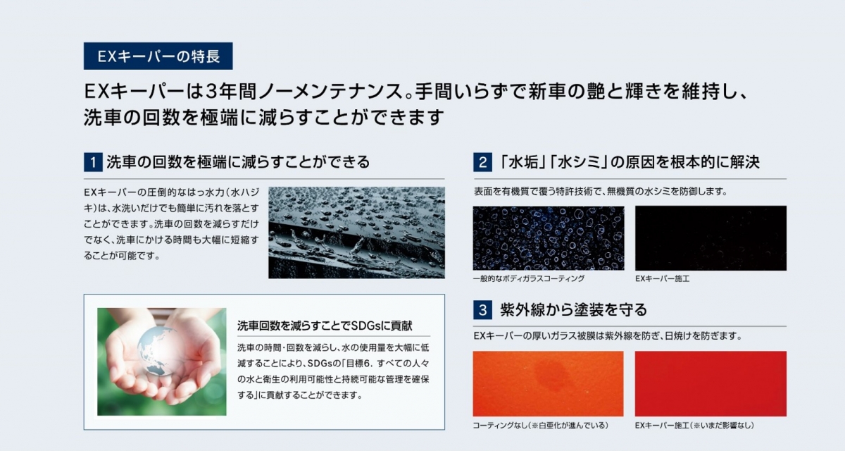 EXキーパーは3年間ノーメンテナンス。手間いらずで新車の艶と輝きを維持し、洗車の回数を極端に減らすことができます。