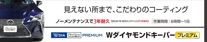 当店、最上級コーティングです。 ★お車のボディーはダブルダイヤキーパー! ★お車の見えない部分(上記10項目)まで施行します! 外側と内側全てコーティングすることで、お車の価値を高めます。 施工時間:約2日? ※お車の状態により施工時間が変更となる場合がございます。 お電話でのご予約、ご来店でのご予約どちらでも大歓迎です! 施工の際は、代車を無料でお貸出し致します。 ※代車が無い場合は予定を変更いただく場合がございます。