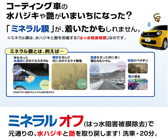 コーティング施行車のツヤ・水ハジキが戻る! ミネラルオフ (コーティング施行車専用) 価格表は画像をタッチしてください