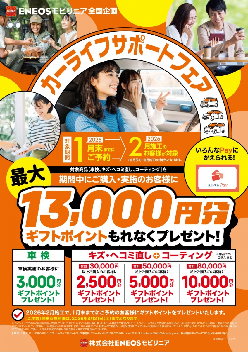 1月末までにご予約、2月施工のお客様に 金額に応じて最大13000円分ギフトポイントプレゼント! キズ・ヘコミ直し、車検も対象なので この機会に是非ご利用ください!! ※車検実施の場合は金額にかかわらず 3000ポイントプレゼントとなります。 ※2月予約の場合は 対象外になりますのでご注意ください