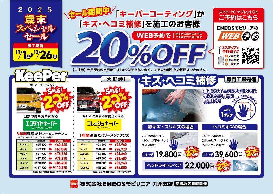 ※施工期間:2025年11月1日~2025年12月26日 ※WEB予約:キーパーサイト・楽天Carサイト・ 当社ホームページからのご予約が対象です。 ※対象商品以外のコーティングはWEB割引の 割引率にて対応となります。 (メンテナンスメニュー・アラカルトメニュー・ EXキーパーは対象外となります。) ※他割引との併用はできません。
