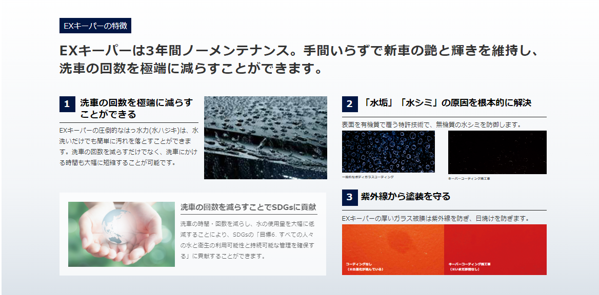 ♢普段のお手入れは、洗車だけでずっとキレイが長続きし、強い水弾きで雨が降っても汚れにくい上に、水シミも付きにくいです。