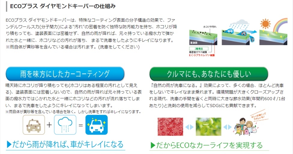 雨が降っても汚れにくくなります。キレイが続いて洗車回数もグッと減ります。