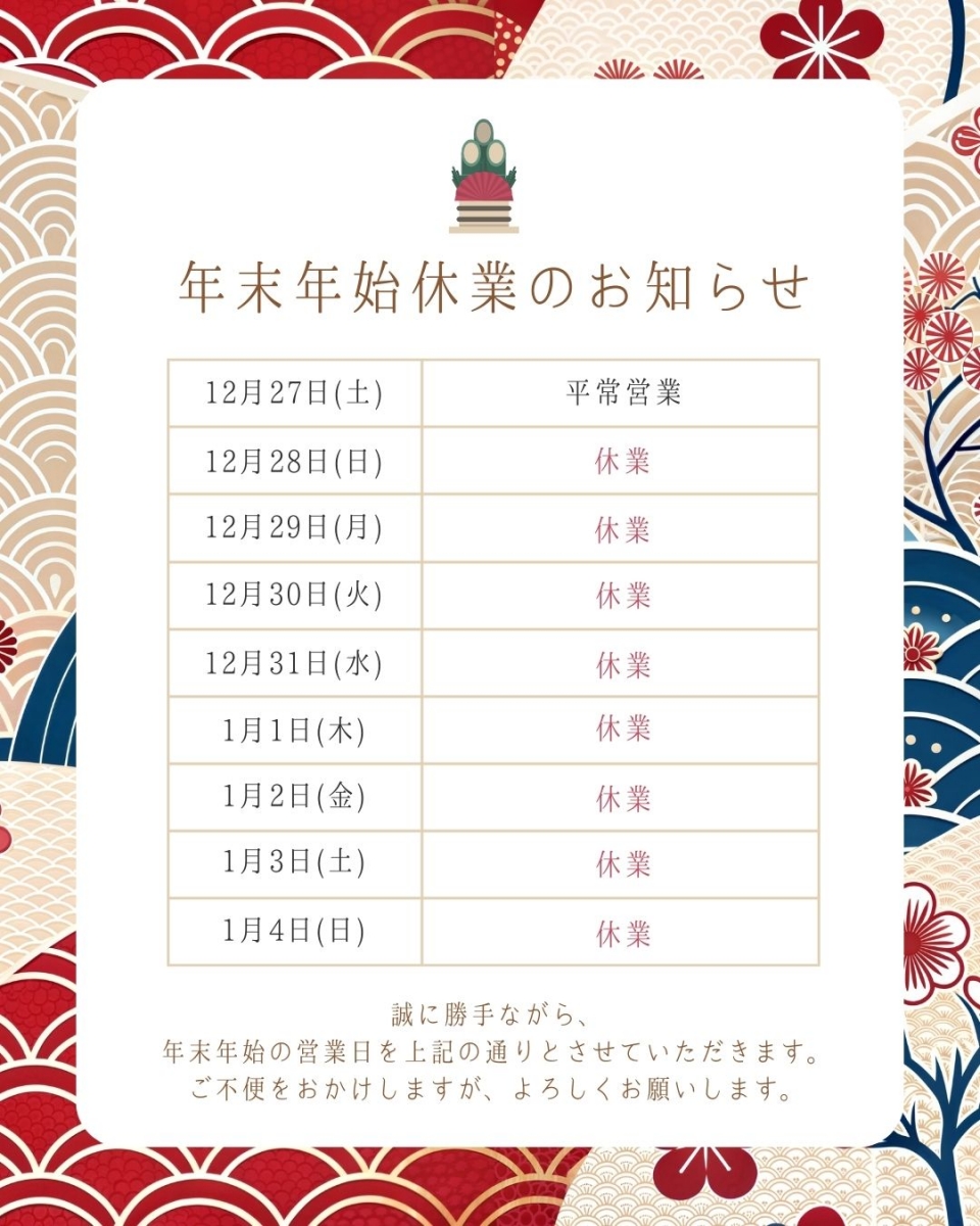 誠に勝手ながら、年末年始の営業日を 下記の通りとさせていただきます🙇♀️