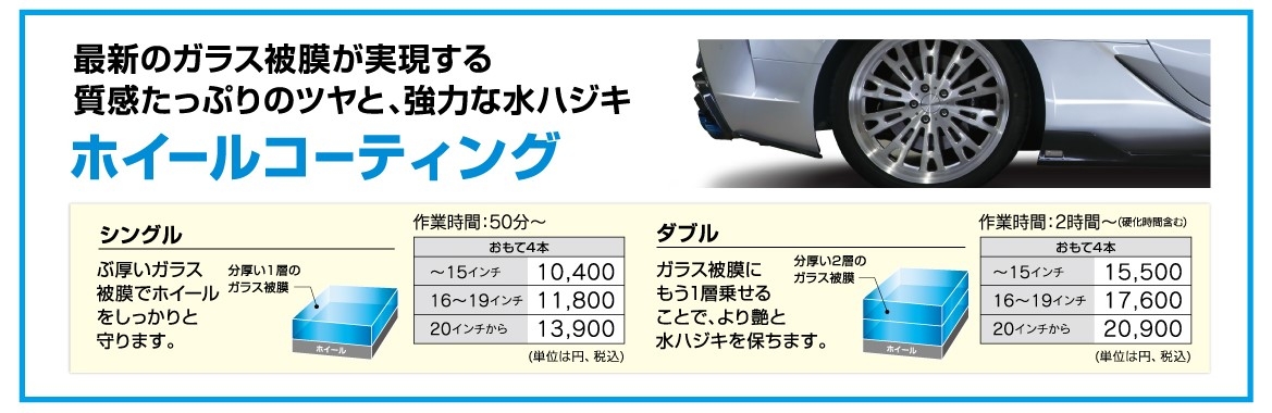 分厚いガラス皮膜でブレーキから出る汚れや泥汚れ、塩害からホイールを守ります!