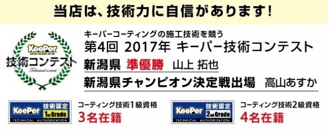 当店スタッフには毎年開かれるキーパーコーティングの技術力を競うコンテストで新潟県決勝まで進んだスタッフが4名在籍しております。