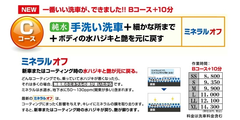 ※プレミアム純水手洗い洗車(Bコース)ミネラルオフ(Cコース)に含まれております。