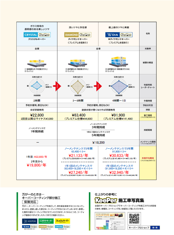 ◆当店取扱いキーパーコーティング早見表◆