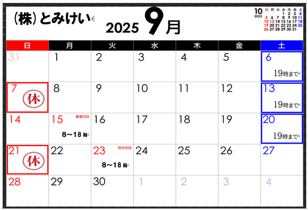 - 平日 7:30~21:00 土曜日7:30~19:00 日曜日・祝日8:00~17:00