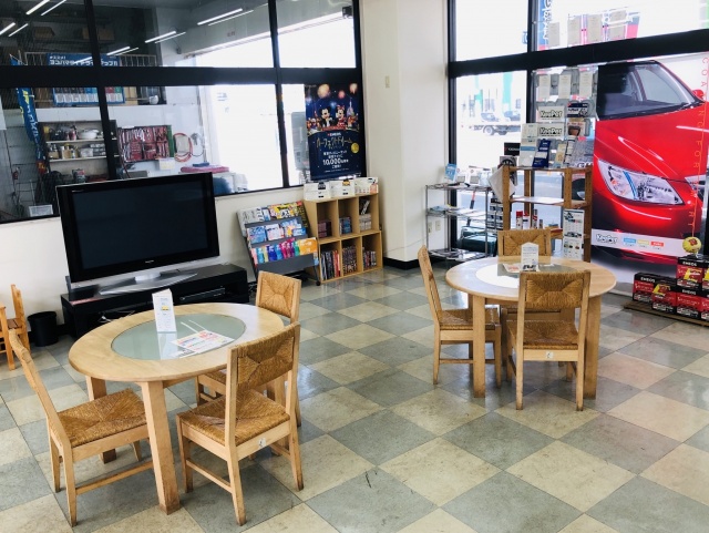 Keeperコーティング中やオイル交換、その他作業をしている間にお待ちいただける待合室があります! 大画面テレビや自動販売機も設置しているので、ゆったりとくつろげるスペースとなっております!