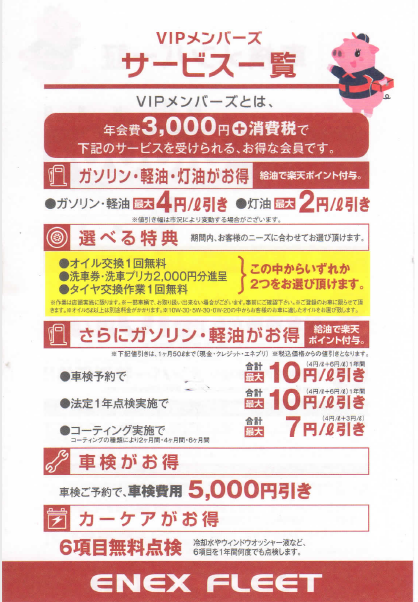 VIP会員入会でガソリン・軽油が店頭価格より常時4円/?引きに加え、コーティング施工値引き7円/?引き(1ヶ月50?まで)
