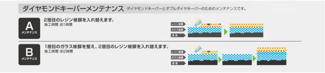 Wダイヤモンドキーパーは、【ガラス被膜】だけでも2層、きちんと乾燥させながら施工します。【ガラス、ガラス、レジン】の3層構造です。