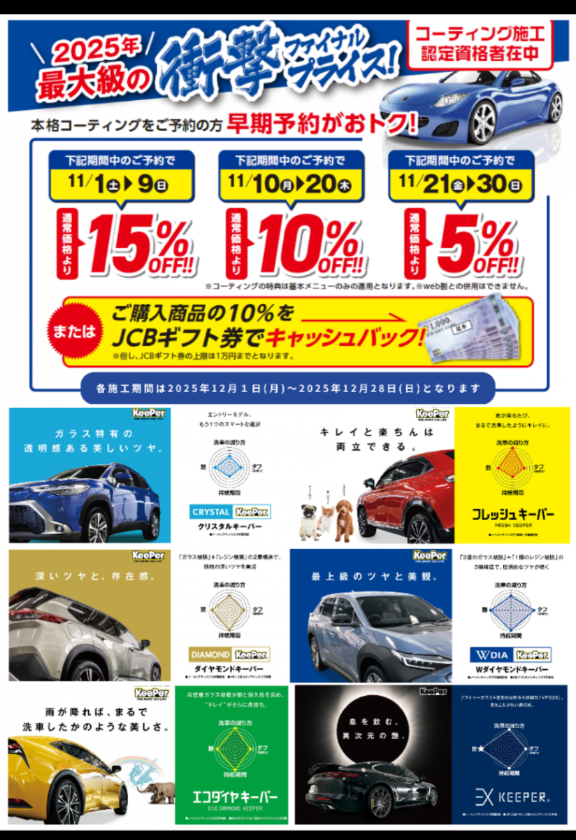 Dr.Driveセルフ東高城店です✨いつも当店をご利用いただきまして誠にありがとうございます!!毎年恒例の12月キャンペーンのお知らせです(^O^)/対象商品はキーパーコーティング、オイル、タイヤ、バ...