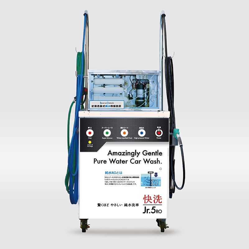 純水とは、きわめて純度の高い水のことで、水以外の不純物をほとんど含みません。水道水は水だけでなく、カルシウムやマグネシウムなどのミネラル成分や、ナトリウムなどの塩類成分を含みます。 そのため、水道水で洗車すると、水垢になってしまうのです。 純水器は一種のろ過装置を使って、これらミネラル成分はもちろん、塩類成分をも除去し純水に近い水に変換できるため、洗車に使用しても水垢になりにくい、またはならない。 ほとんど拭き取りもいらないほどですから、洗車はかなり楽になります。