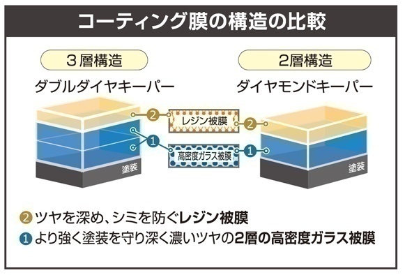 2層構造1層目が高密度なガラス被膜2層目レジン被膜、1層目が高密度ガラス被膜でより強く塗装を守り深く濃いツヤを出す、2層目のレジン被膜が身代わりとなり外部の汚れ(攻撃)を受け止める!!!